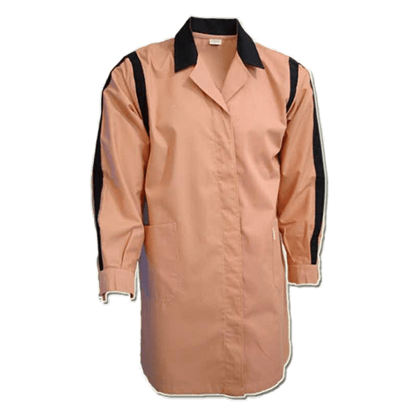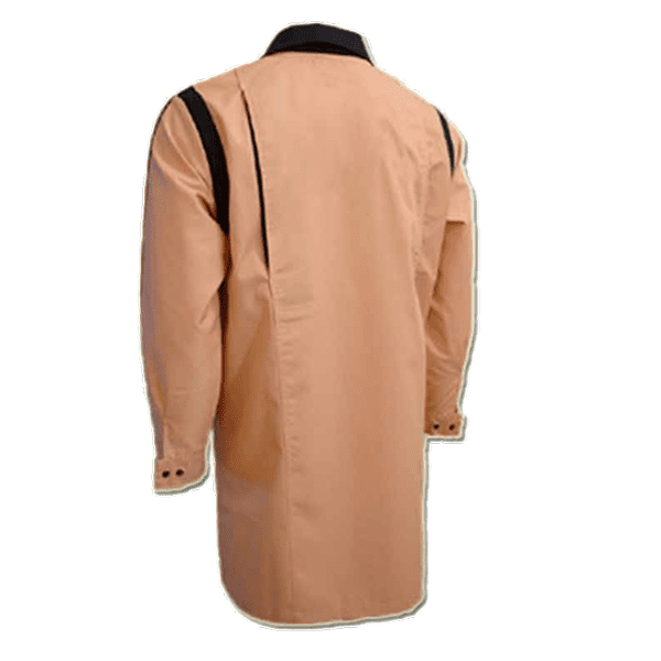 Bata abertura frontal c/mola ou botão e lapela de proteção, manga comprida, faixa decorativa circular nos ombros, na junção c/as mangas, fole expansão nas costas em 2ª cor, faixa longitudinal decorativa nos braços, decoração em 2ª cor, dois bolsos inferiores, dois ilhós respiração em cada axila.