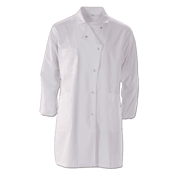 Bata , abertura lateral, dois bolsos inferiores e um superior direito, dois ilhós respiração em cada axila, punhos c/elástico.